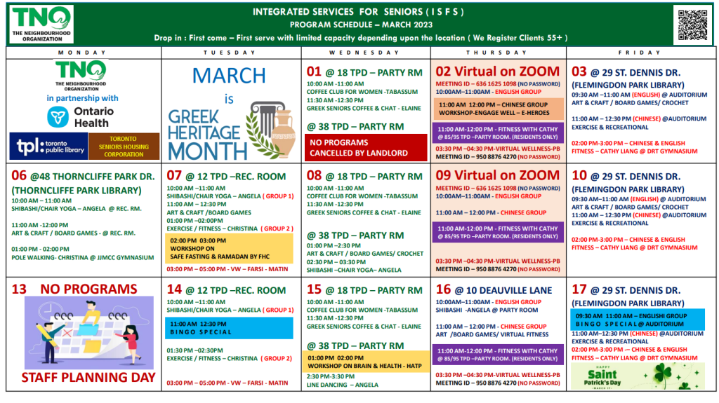 The March 2023 calendar for TNO Seniors Programs in Thorncliffe Park and Flemingdon Park is now available. Follow the link for more info.